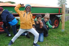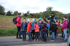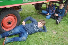 Dieses Jahr war es nicht sonnig, aber wenigstens (fast) trocken. Klassenlehrerin Carina Riehle der 3a mit 16 Kindern zum ersten Durchgang um 09:30, der Klassenlehrer der 3b, Thomas Frey, mit 19 Kindern um 12:00 Uhr zum zweiten Termin. Nachmittags mussten alle einen kurzen Schauer erdulden. Bevor die Ernte los ging wurden den Schülern Erntewerkzeug und Sicherheit an den Maschinen erläutert.