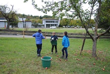Mit dem Rollblitz ging es mit großem Elan an das aufsammeln der Äpfel. Der Rollblitz übte eine besondere Faszination auf die Schüler aus, jede und jeder wollte mal rollen. Überhaupt ist der Lehrgarten mit den vielen Bäumen faszinierend für die Schüler, eben ein großer natürlicher Spielplatz. Die gesammelten Äpfel wurden von den Schülern, unterstützt von Winfried Bischof und Hans-Jörg Hack gewaschen und in historischen Geräten zerkleinert und unter Anleitung gepresst.