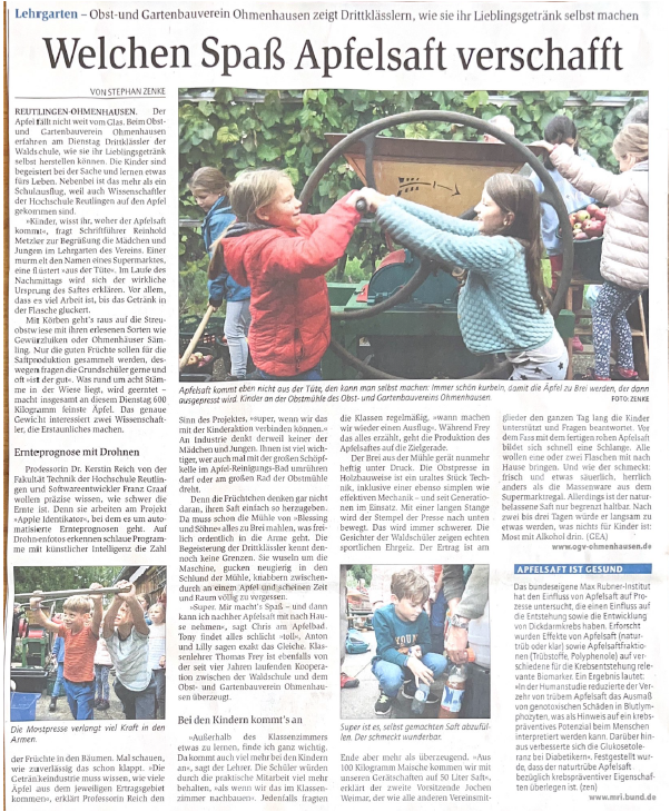 Am Nachmittag war die Klasse 3b dran und zwar mit 23 Kindern. Diese wurden von der Lokalpresse, dem GEA, begleitet. Wie der Journalist das gesehen hat liest sich im nachfolgenden Artikel des GEA. Er war von der Veranstaltung sehr angetan. Die 3b machte am Nachmittag die 600 kg ausgepresstes Obst voll. Das heißt, dass die Kinder beider Klassen so um die 350 l Saft hergestellt haben. Und das mit Handarbeit. Ein großes Lob an die beiden Klassen von OGV Seite!