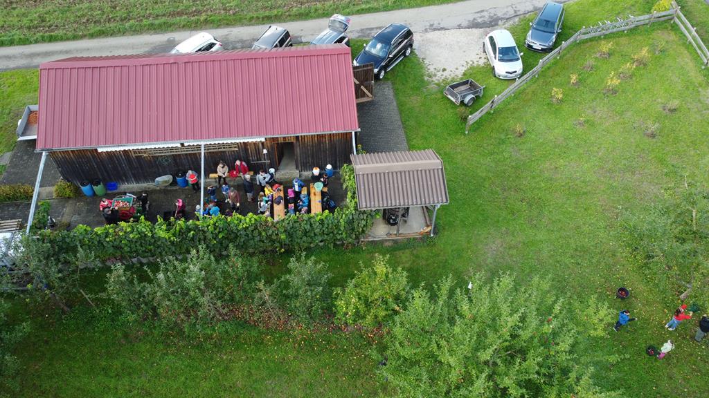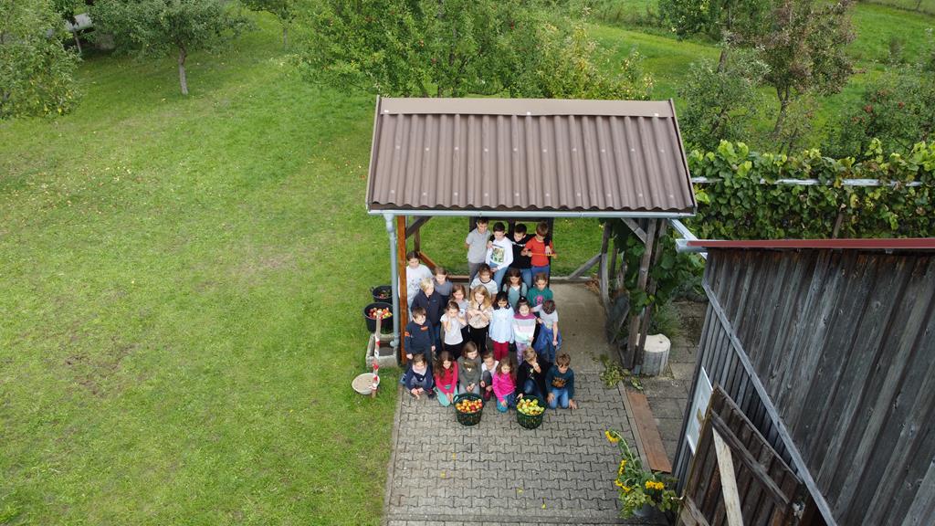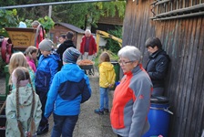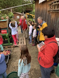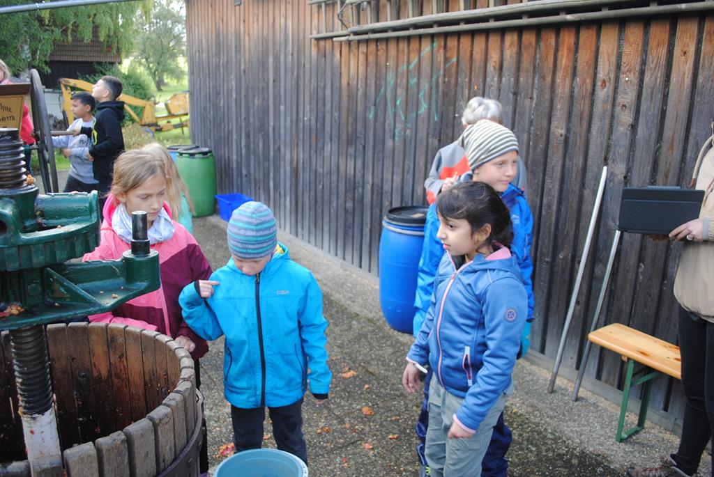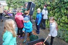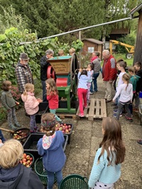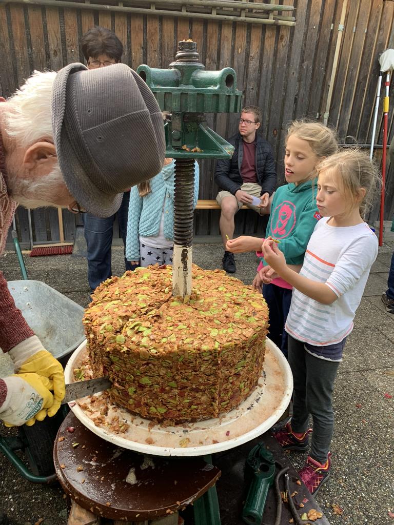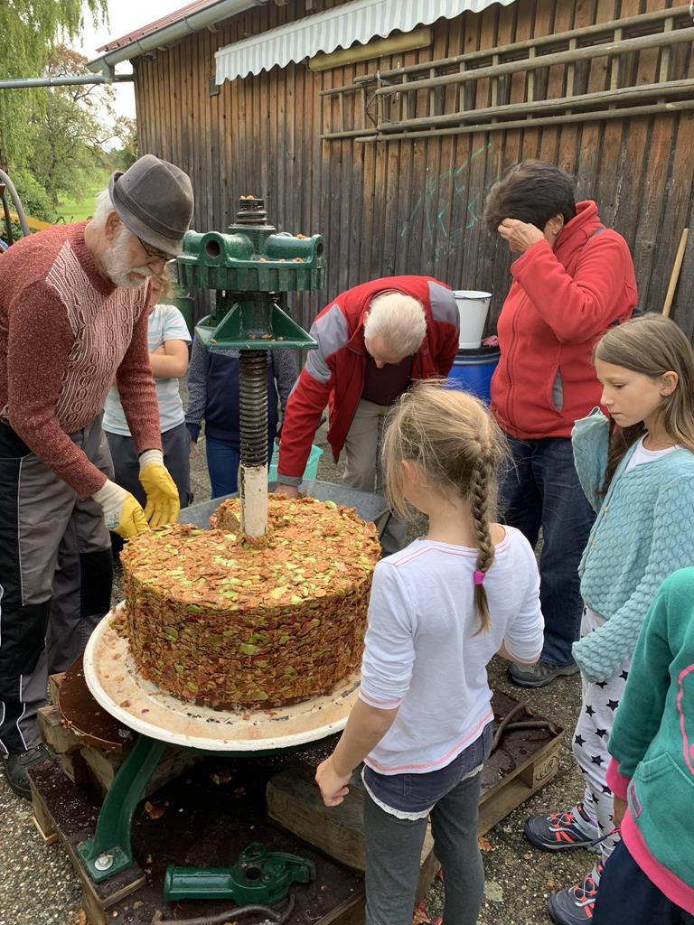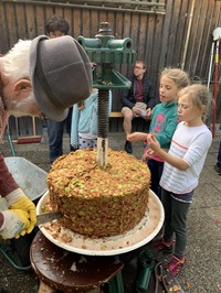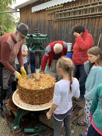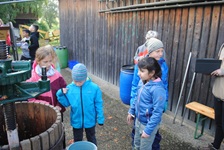 Am Vormittag kam die Klasse 3a mit 21 Kindern zu Besuch beim OGV. Wie immer muss man ein paar Regeln erklären. Danach geht es zum Äpfel auflesen, gute von den schlechten zu trennen. Die guten kommen zur Obstmühle. Wenn die Äpfel klein gemahlen sind werden sie in die Obstpresse geschüttet. Ist diese voll wird gepresst, ganz und gar mit Muskelkraft. Das Ergebnis fließt in Form von Apfelsaft bzw. Süßmost in einen Eimer, der aber ständig gegen leere Eimer ausgetauscht werden muss. Der Saft wird in ein Fass mit Hahn geschüttet. Die Kinder holen dann ihren wohlverdienten Lohn in Form von Saft in die mitgebrachten Flaschen ab. Das ausgepresste Häckselgut, der Trester, wird in einen Anhänger eines Jägers verfrachtet, der den Trester dann an das Wild verfüttert.