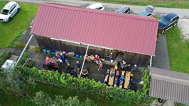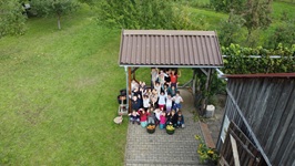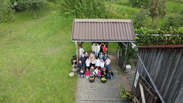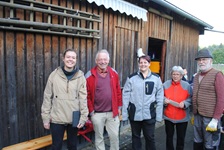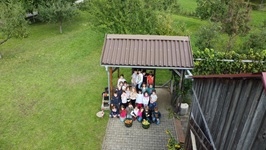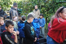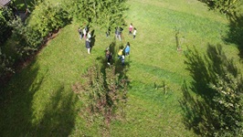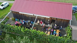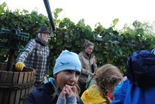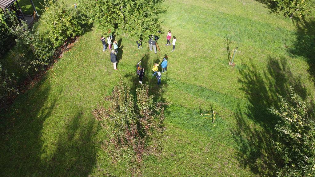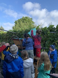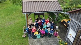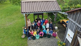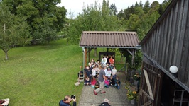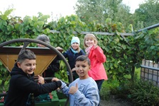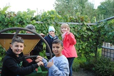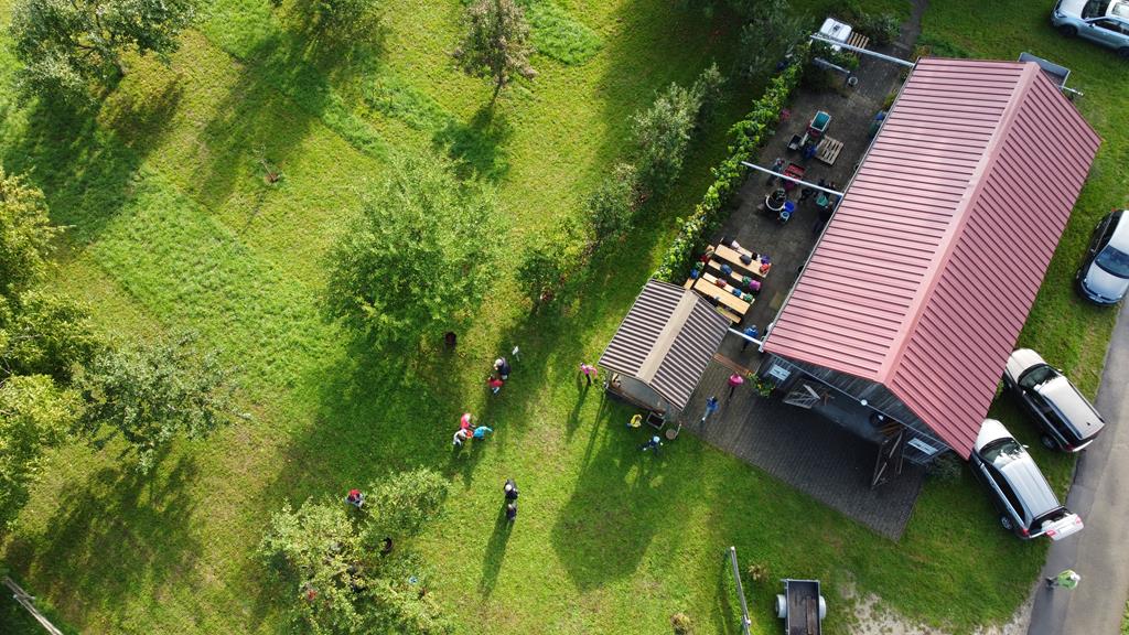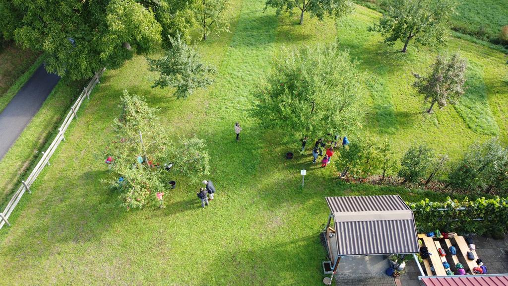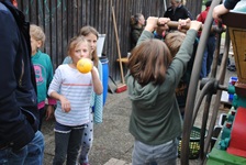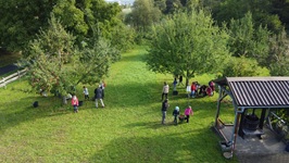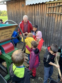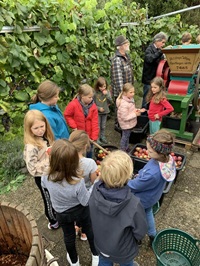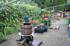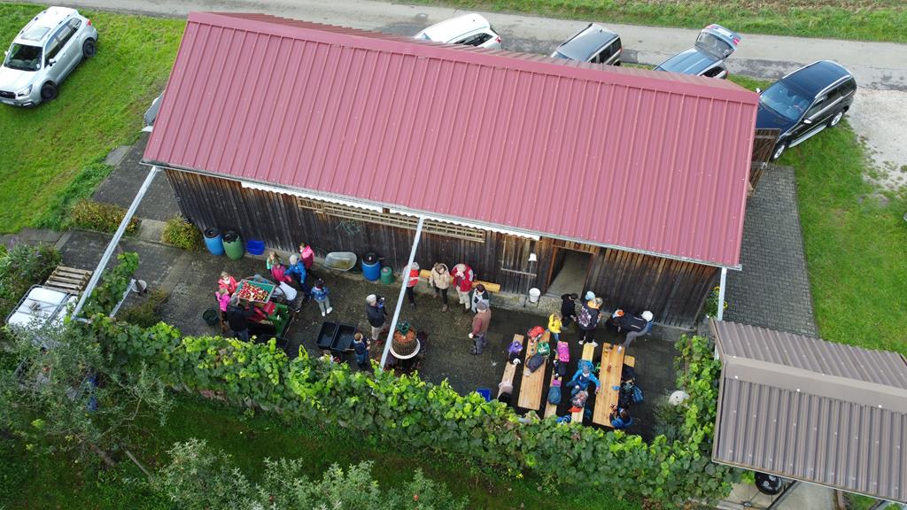 Am Vormittag kam die Klasse 3a mit 21 Kindern zu Besuch beim OGV. Wie immer muss man ein paar Regeln erklären. Danach geht es zum Äpfel auflesen, gute von den schlechten zu trennen. Die guten kommen zur Obstmühle. Wenn die Äpfel klein gemahlen sind werden sie in die Obstpresse geschüttet. Ist diese voll wird gepresst, ganz und gar mit Muskelkraft. Das Ergebnis fließt in Form von Apfelsaft bzw. Süßmost in einen Eimer, der aber ständig gegen leere Eimer ausgetauscht werden muss. Der Saft wird in ein Fass mit Hahn geschüttet. Die Kinder holen dann ihren wohlverdienten Lohn in Form von Saft in die mitgebrachten Flaschen ab. Das ausgepresste Häckselgut, der Trester, wird in einen Anhänger eines Jägers verfrachtet, der den Trester dann an das Wild verfüttert.
